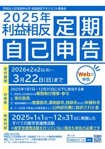 本法人における利益相反マネジメントの一環として、利益相反定期自己申告を2026年2月2日から実施しますので、対象者の方は定期自己申告を行って下さい。