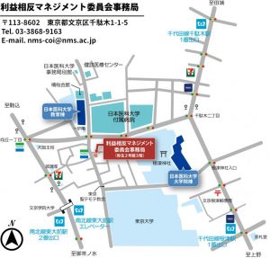 利益相反に関する相談について 本法人の教職員であれば、随時、メールもしくは学内便にて相談が可能です。 書式は自由ですので、ご所属、お名前、連絡先が分かる形で書面にてご相談ください。 以下の相談窓口に、お気軽にご連絡ください。 相談窓口 利益相反マネジメント委員会事務局 E-mail:nms-coi★nms.ac.jp(★を@にしてご利用ください) 地図・交通